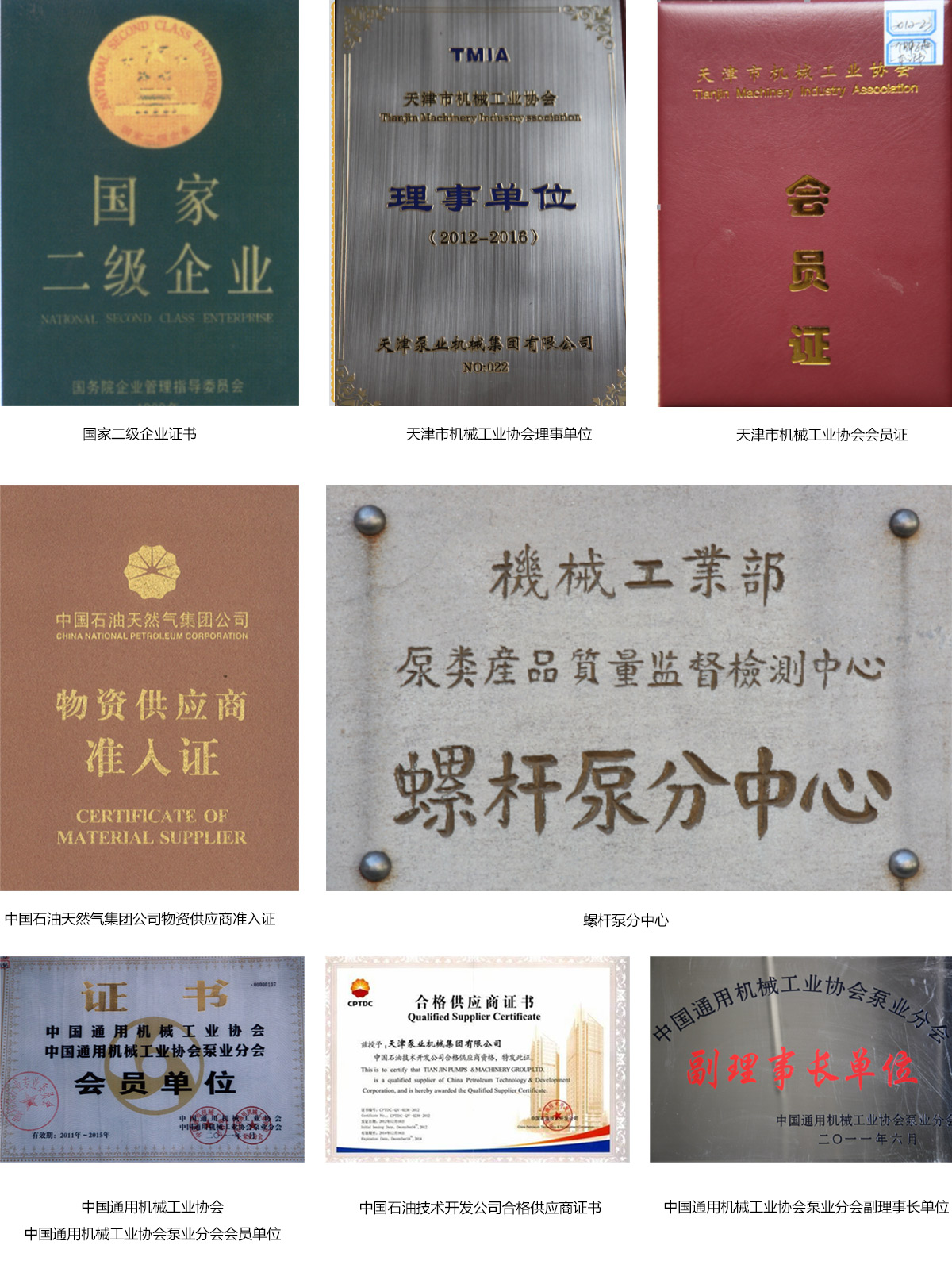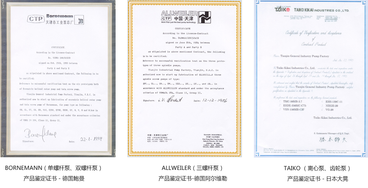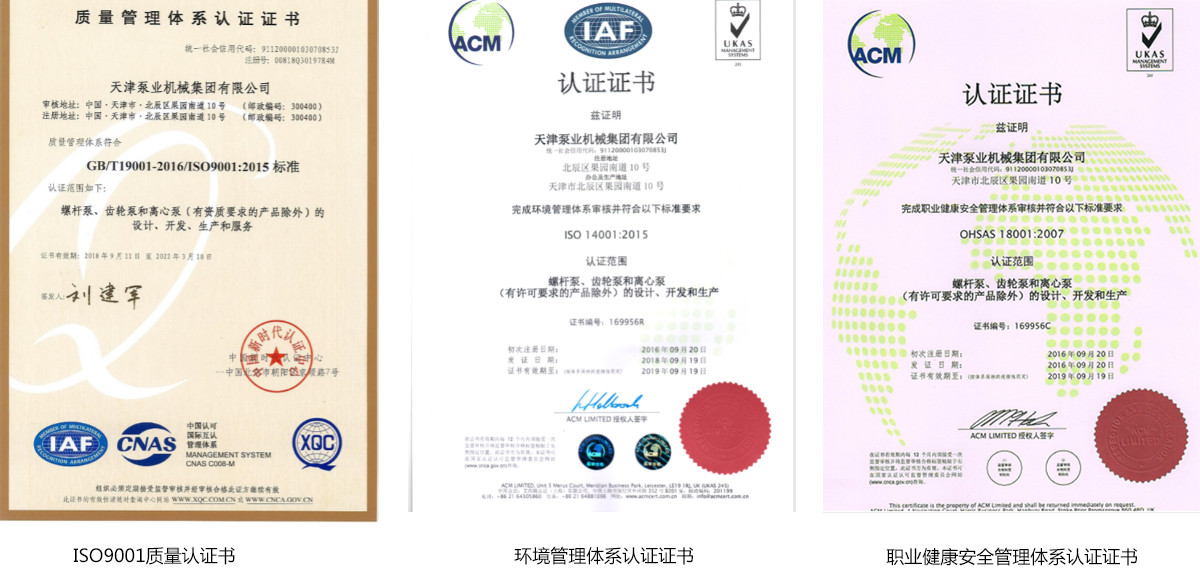 1994年CTP在中國泵行業(yè)獲得ISO9001國際質(zhì)量標準認證, 1997年在中國通用機械行業(yè)和水泵行業(yè)通過國軍標GJB/Z9001質(zhì)量管理體系審核。2007年又通過了中國新時代質(zhì)量認證中心的GB/T19001-2000和GJB/9001A-2001質(zhì)量認證。2016年通過了ISO 14001:2004環(huán)境管理體系認證證書和OHSAS 18001:2007職業(yè)健康安全管理體系認證證書.CTP的質(zhì)量保證體系運行可靠。